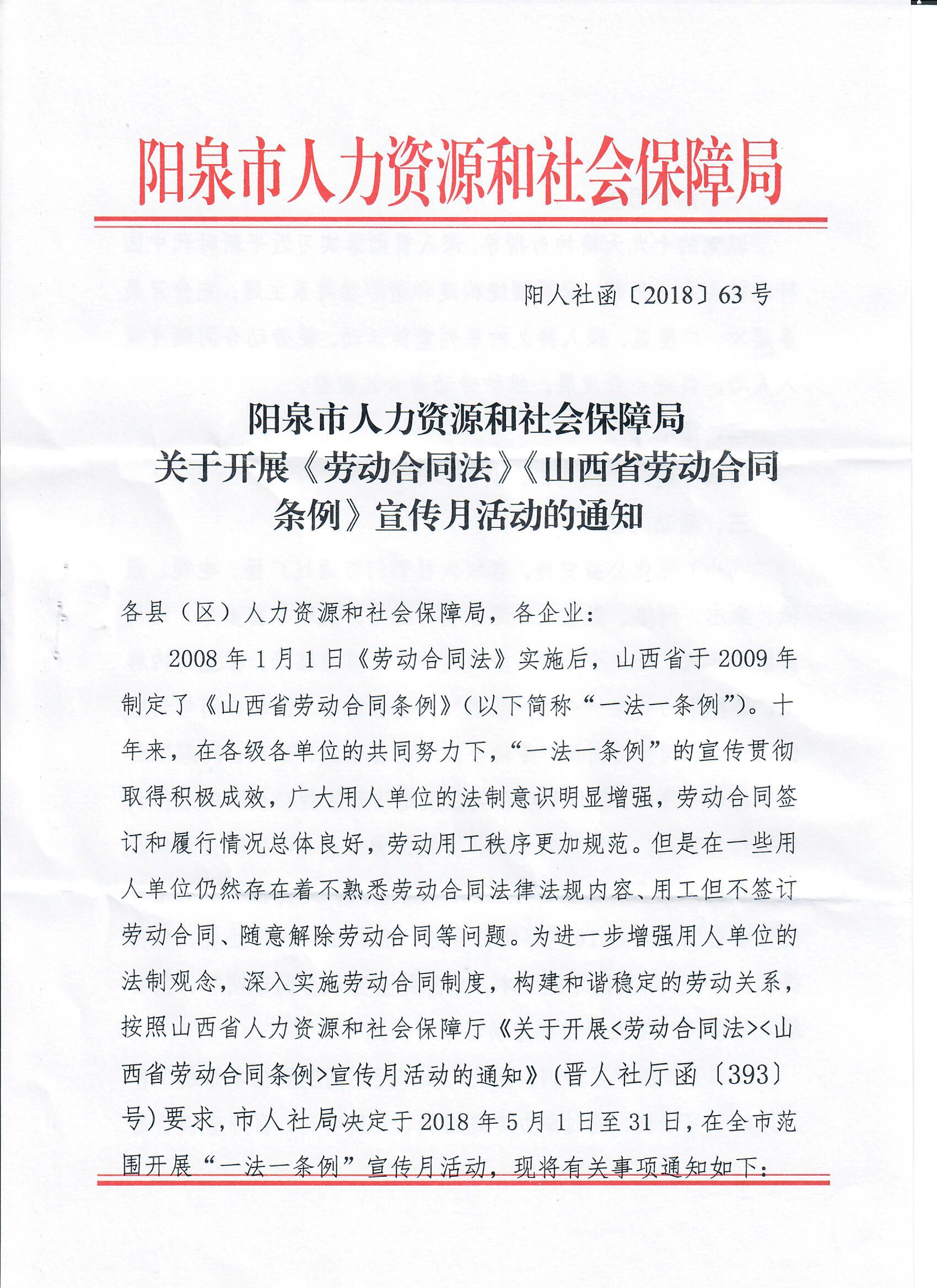 陽泉市人力資源和社會保障局關(guān)于開展《勞動合同法》《山西省勞動合同條例》宣傳月活動的通知
