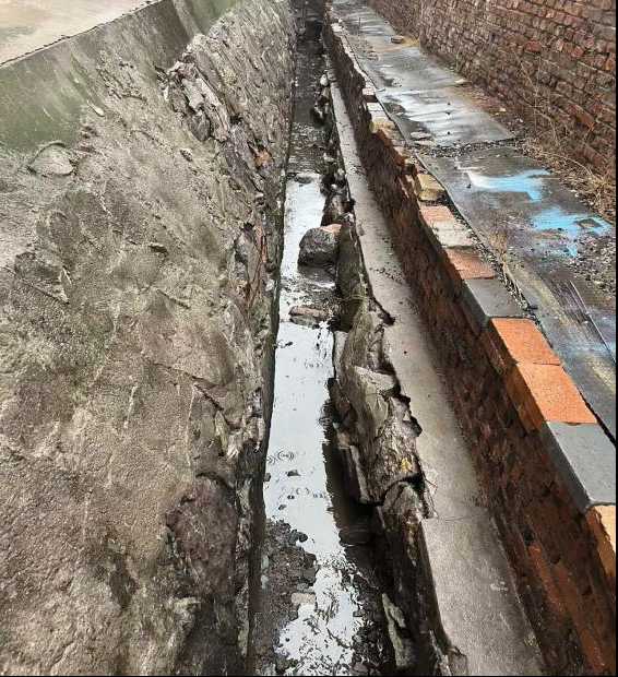 主體單位物阜公司高度重視,第一時(shí)間組織人力、物力資源,以“先通后固、全程控質(zhì)”原則,迅速組織工程施工:一是全面清淤疏通,打通排水通道。優(yōu)先處理淤積“堵點(diǎn)”,破碎結(jié)塊淤泥,再通過(guò)小型吸污泵將雜物輸送至指定地點(diǎn)進(jìn)行處理;清淤后用高壓水槍沖洗渠壁,確保溝渠整潔無(wú)殘留。二是破損部位重建,修復(fù)結(jié)構(gòu)缺陷。對(duì)水泥空鼓、磚體松動(dòng)段,先拆除破損部分,繼而選用磚塊、水泥,錯(cuò)縫重新壘砌,杜絕二次空鼓,渠體結(jié)構(gòu)穩(wěn)定性得到全面恢復(fù)。三是三面硬化加固,提升抗災(zāi)能力。對(duì)整改后所有渠段實(shí)施“底部+兩側(cè)壁”硬化,嚴(yán)格按照施工標(biāo)準(zhǔn),采用混凝土進(jìn)行澆筑,并針對(duì)塌陷段額外加固,徹底消除塌陷風(fēng)險(xiǎn)。