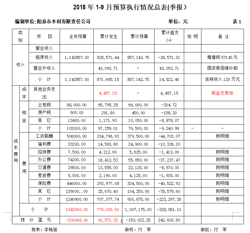 陽泉市木材有限責任公司成立于1998年,前身為陽泉市木材公司,隸屬于陽泉市物質(zhì)集團公司。2003年8月,經(jīng)上級有關(guān)部門認定為特困企業(yè),在養(yǎng)老、失業(yè)、醫(yī)保繳納等方面享受特困企業(yè)優(yōu)惠政策。現(xiàn)有工作人員14人。主要經(jīng)濟來源場地租賃。現(xiàn)將1-9月份預(yù)算執(zhí)行情況及財務(wù)報表公示如下: