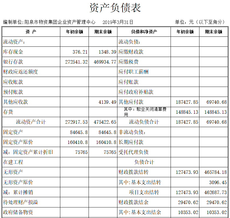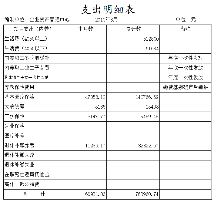 陽(yáng)泉市物資集團(tuán)公司企業(yè)資產(chǎn)管理中心成立于2014年11月,是物資集團(tuán)公司原化輕總公司等七家歇業(yè)關(guān)閉企業(yè)的留守機(jī)構(gòu),隸屬于陽(yáng)泉市物資集團(tuán)公司。截止3月份底,企業(yè)總?cè)藬?shù)666人,其中在冊(cè)職工351人,離退休職工315人。在冊(cè)職工按照年齡結(jié)構(gòu)劃分“40、50”以下人員133人,“40、50”以上人員218人。在冊(cè)職工生活和社保等費(fèi)用享受財(cái)政補(bǔ)貼。1-3月份發(fā)放內(nèi)養(yǎng)人員生活費(fèi)51萬(wàn)元,繳納醫(yī)療保險(xiǎn)17萬(wàn)元,為5名到齡退休人員辦理了退休手續(xù)。現(xiàn)將一季度財(cái)務(wù)狀況及支出情況公示如下: