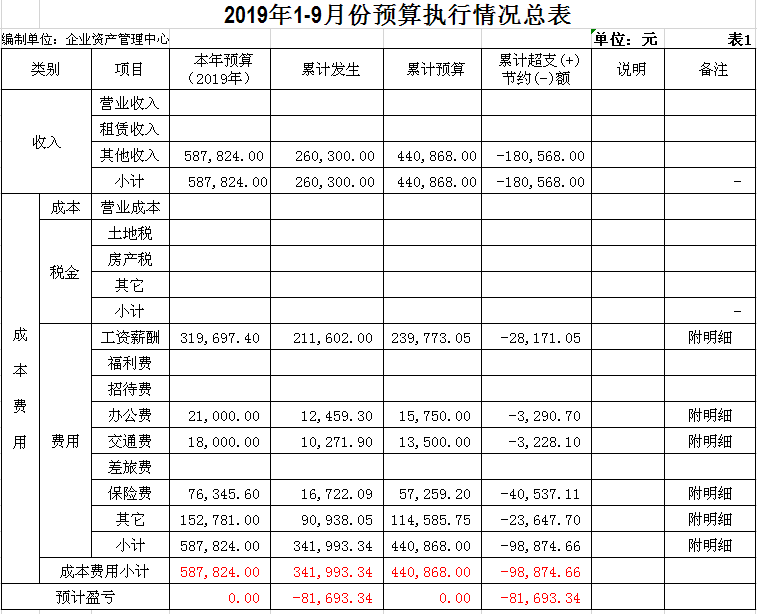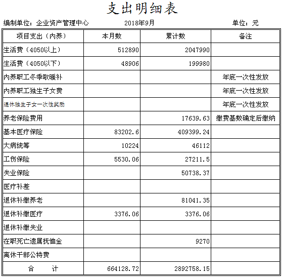 陽泉市物資集團(tuán)公司企業(yè)資產(chǎn)管理中心成立于2014年11月,是物資集團(tuán)公司原化輕總公司等七家歇業(yè)關(guān)閉企業(yè)的留守機構(gòu),隸屬于陽泉市物資集團(tuán)公司。截止9月份底,企業(yè)總?cè)藬?shù)663人,其中在冊職工346人,離退休職工317人。在冊職工按照年齡結(jié)構(gòu)劃分“40、50”以下人員127人,“40、50”以上人員219人。在冊職工生活和社保等費用享受財政補貼。1-9月份發(fā)放內(nèi)養(yǎng)人員生活費225萬元,繳納醫(yī)療保險54萬元,為8名到齡退休人員辦理了退休手續(xù)?,F(xiàn)將三季度財務(wù)狀況及支出情況公示如下: