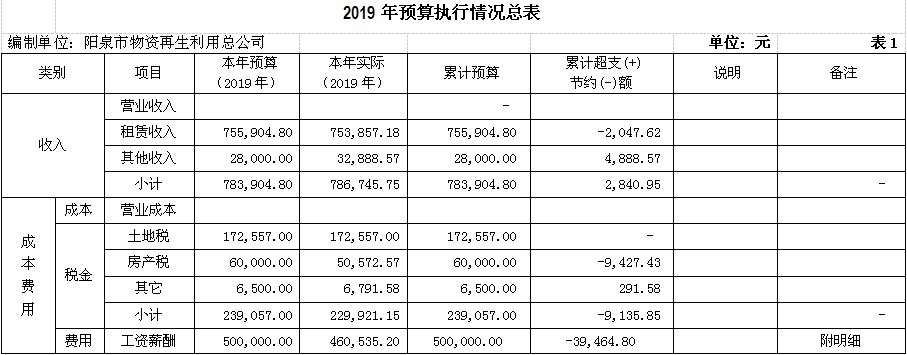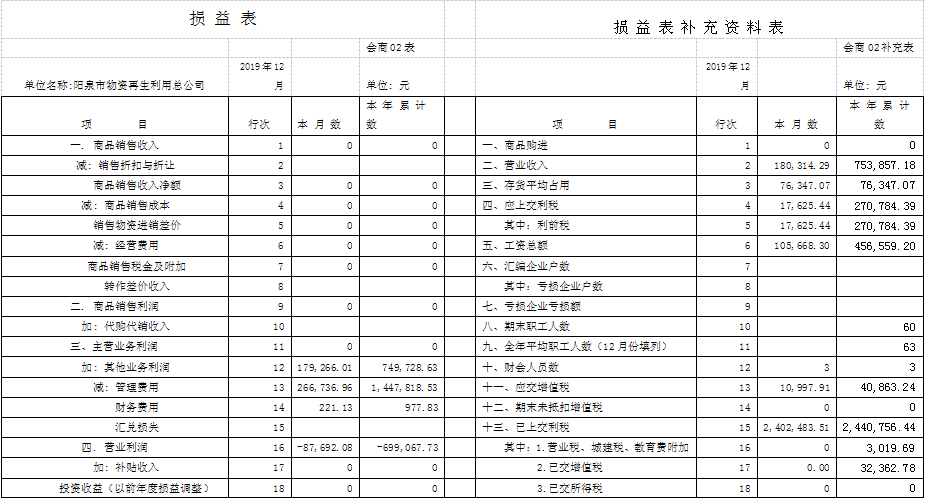 截止12月31日,物資再生利用總公司實(shí)現(xiàn)收入總額78.67萬元,完成全年預(yù)算78.39萬元的100.36%,比去年同期84.61萬元減少了5.94萬元;發(fā)生費(fèi)用146.31萬元,完成全年預(yù)算146.39萬元的99.95%,比去年同期132.38萬元增加了13.93萬元;利潤(rùn)-67.64萬元,完成全年預(yù)算-68萬元的99.47%,比去年同期-47.77萬元增虧19.87萬元;在崗人員工資按陽(yáng)泉市2015年最低標(biāo)準(zhǔn)按時(shí)發(fā)放,“40、50”人員、內(nèi)退人員工資也按月發(fā)放。全部職工醫(yī)療、失業(yè)保險(xiǎn)也都如期上繳,為2名(全年累計(jì)6名)到齡職工如期辦理了退休手續(xù);向郊區(qū)檔案館移交了五名退休職工檔案;公司轉(zhuǎn)型取得較大進(jìn)展;公司制改制工作先機(jī)完成 。