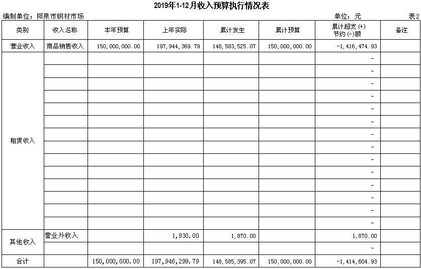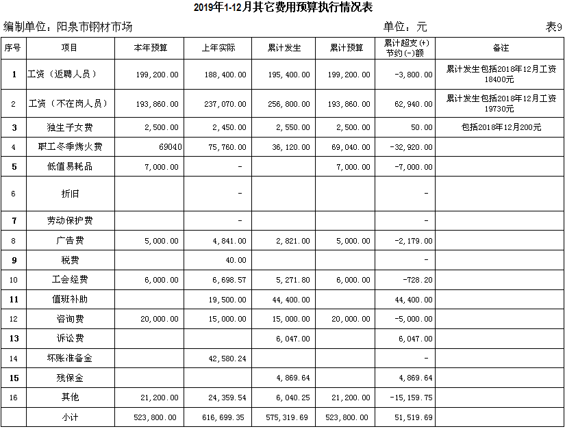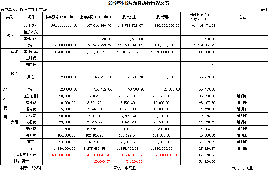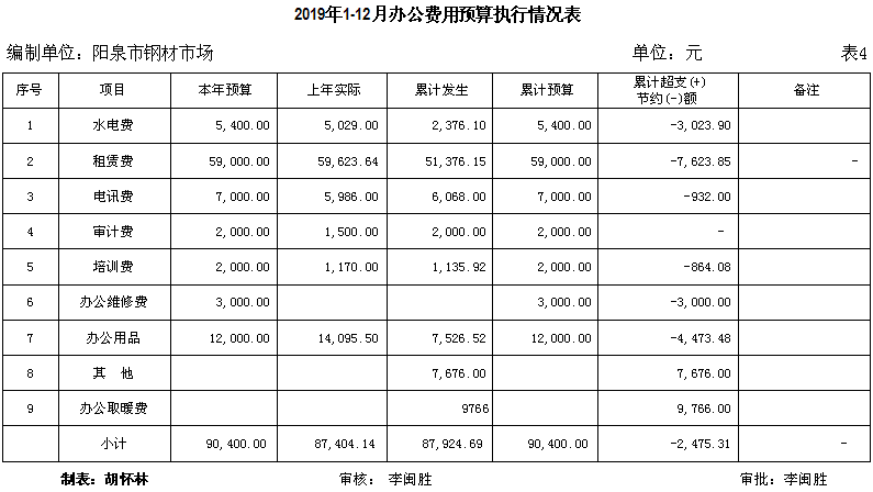 2019年物資集團(tuán)加強(qiáng)了企業(yè)預(yù)算化管理,利用預(yù)算化這個(gè)強(qiáng)有力的財(cái)務(wù)手段,對(duì)各類經(jīng)濟(jì)市場(chǎng)實(shí)時(shí)監(jiān)控,隨時(shí)監(jiān)管起了重要作用。截止2019年12月31日我鋼材市場(chǎng)銷售收入14858.35萬(wàn)元(不含稅),完成全年預(yù)算1.5億元(不含稅)的99.06%。這是在當(dāng)前我市經(jīng)濟(jì)萎縮,生產(chǎn)資料市場(chǎng)環(huán)境整體低迷,銷售不暢的情況下取得的,實(shí)屬不易。目前行政性成本費(fèi)用實(shí)際發(fā)生14863.47萬(wàn)元,占預(yù)算 15000萬(wàn)元的99.09 %。