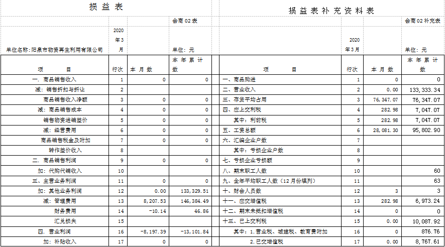 截止3月31日,物資再生利用有限公司因政府土地收儲、疫情等疊加原因,收入總額為13.3萬元,比去年同期23.4萬元銳減10.1萬元,完成年預算44萬元的30%;發(fā)生各項費用14.6萬元,比去年同期37.6萬元減少23萬元,完成年預算112萬元的13%;利潤-1.3萬元,比去年同期-15.8萬元減虧14.5萬元;在崗人員工資按陽泉市現(xiàn)行最低標準按時發(fā)放,“40、50”人員、內(nèi)退人員工資也按月發(fā)放。