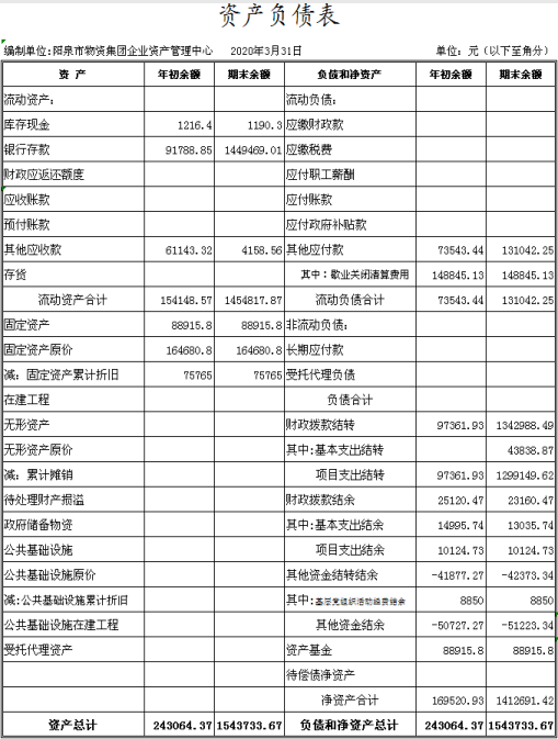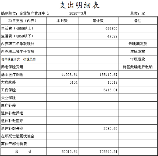 陽泉市物資集團公司企業(yè)資產(chǎn)管理中心成立于2014年11月,是物資集團公司原化輕總公司等七家歇業(yè)關閉企業(yè)的留守機構(gòu),隸屬于陽泉市物資集團公司。截止3月份底,企業(yè)總?cè)藬?shù)660人,其中在冊職工331人,離退休職工329人。在冊職工按照年齡結(jié)構(gòu)劃分“40、50”以下人員122人,“40、50”以上人員209人。在冊職工生活和社保等費用享受財政補貼。1-3月份發(fā)放內(nèi)養(yǎng)人員生活費54.7萬元,繳納醫(yī)療保險15.5萬元,為9名到齡退休人員辦理了退休手續(xù)。現(xiàn)將一季度財務狀況及支出情況公示如下: