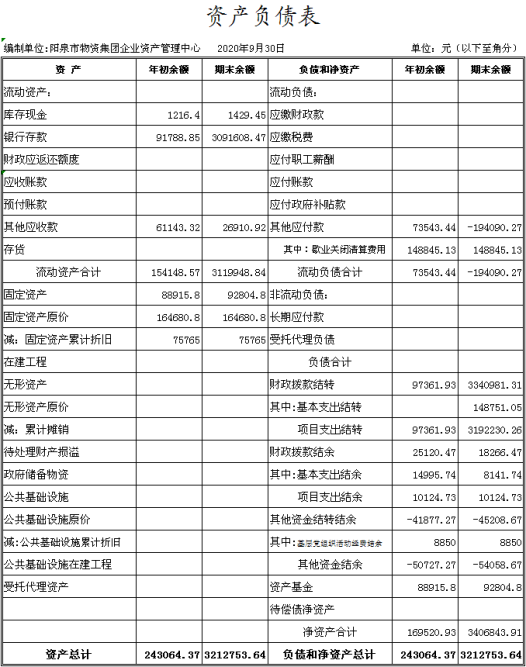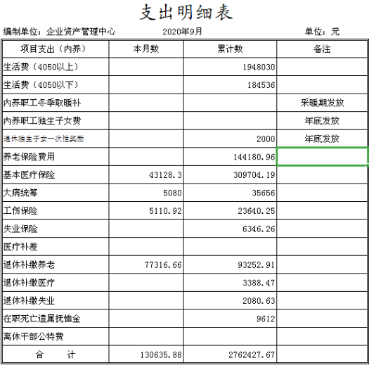 陽泉市物資集團(tuán)公司企業(yè)資產(chǎn)管理中心成立于2014年11月,是物資集團(tuán)公司原化輕總公司等七家歇業(yè)關(guān)閉企業(yè)的留守機(jī)構(gòu),隸屬于陽泉市物資集團(tuán)公司。截止9月份底,企業(yè)總?cè)藬?shù)657人,其中在冊職工319人,離退休職工338人。在冊職工按照年齡結(jié)構(gòu)劃分“40、50”以下人員117人,“40、50”以上人員202人。在冊職工生活和社保等費(fèi)用享受財(cái)政補(bǔ)貼。1-9月份發(fā)放內(nèi)養(yǎng)人員生活費(fèi)214萬元,繳納養(yǎng)老保險(xiǎn)14萬元,繳納醫(yī)療保險(xiǎn)35萬元,為24名到齡退休人員辦理了退休手續(xù)?,F(xiàn)將三季度財(cái)務(wù)狀況及支出情況公示如下:
