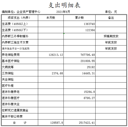 陽泉市物資集團公司企業(yè)資產(chǎn)管理中心成立于2014年11月,是物資集團公司原化輕總公司等七家歇業(yè)關(guān)閉企業(yè)的留守機構(gòu),隸屬于陽泉市物資集團公司。截止6月份底,企業(yè)總?cè)藬?shù)650人,其中在冊職工300人,離退休職工350人。在冊職工按照年齡結(jié)構(gòu)劃分“40、50”以下人員104人,“40、50”以上人員196人。在冊職工生活和社保等費用享受財政補貼。1-6月份發(fā)放內(nèi)養(yǎng)人員生活費149萬元,繳納養(yǎng)老保險77萬元,繳納醫(yī)療保險24萬元,為8名到齡退休人員辦理了退休手續(xù)。現(xiàn)將上半年財務(wù)狀況及支出情況公示如下: