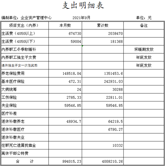 陽(yáng)泉市物資集團(tuán)公司企業(yè)資產(chǎn)管理中心成立于2014年11月,是物資集團(tuán)公司原化輕總公司等七家歇業(yè)關(guān)閉企業(yè)的留守機(jī)構(gòu),隸屬于陽(yáng)泉市物資集團(tuán)公司。截止9月份底,企業(yè)總?cè)藬?shù)649人,其中在冊(cè)職工298人,離退休職工351人。在冊(cè)職工按照年齡結(jié)構(gòu)劃分“40、50”以下人員103人,“40、50”以上人員195人。在冊(cè)職工生活和社保等費(fèi)用享受財(cái)政補(bǔ)貼。1-9月份發(fā)放內(nèi)養(yǎng)人員生活費(fèi)222萬(wàn)元,繳納養(yǎng)老保險(xiǎn)141萬(wàn)元,繳納醫(yī)療保險(xiǎn)28萬(wàn)元,為9名到齡退休人員辦理了退休手續(xù)?,F(xiàn)將上半年財(cái)務(wù)狀況及支出情況公示如下: