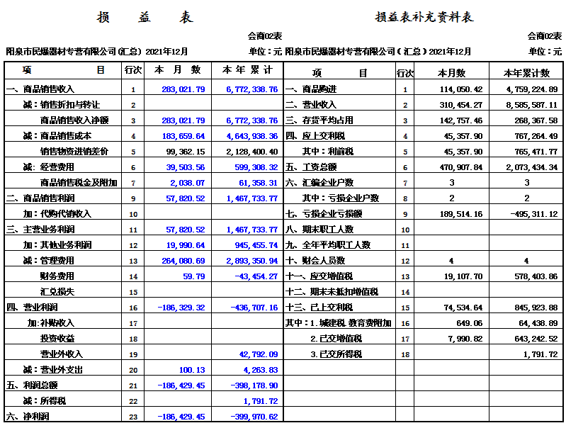 2021年,民爆公司實現(xiàn)營業(yè)收入859萬元(其中租賃收入37萬元,服務(wù)收入103萬元,運輸收入41萬元),比去年同期的761萬元增加98萬元;發(fā)生費用345萬元,比去年同期的330萬元減少15萬:利潤-40萬元,比去年同期的-21萬元增虧19萬元。