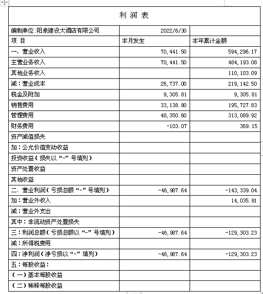 2022年1-6月份,酒店?duì)I業(yè)收入為59.43萬元,營(yíng)業(yè)成本為21.91萬元,稅金及附加0.93萬元,銷售費(fèi)用為19.57萬元,管理費(fèi)用為31.31萬元,財(cái)務(wù)費(fèi)用為0.04萬元,營(yíng)業(yè)利潤(rùn)為-14.33萬元,營(yíng)業(yè)外收入為1.40萬元,利潤(rùn)總額為-12.93萬元,凈利潤(rùn)為-12.93萬元。